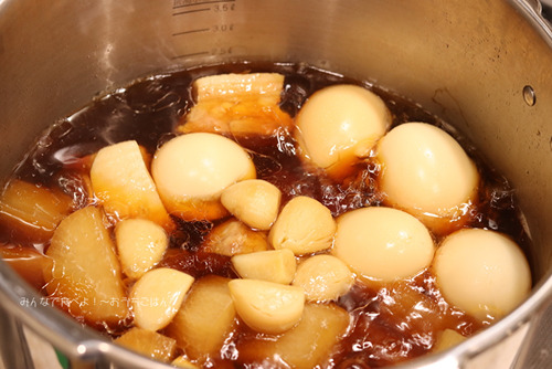水、醤油、本みりん、料理酒、砂糖、ニンニク、ゆでたまごを入れて