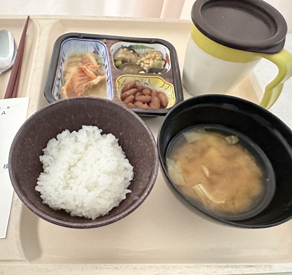 朝食:赤魚のきのこあんかけ、なすの大豆そぼろ煮、うずら豆煮、味噌汁(減塩)