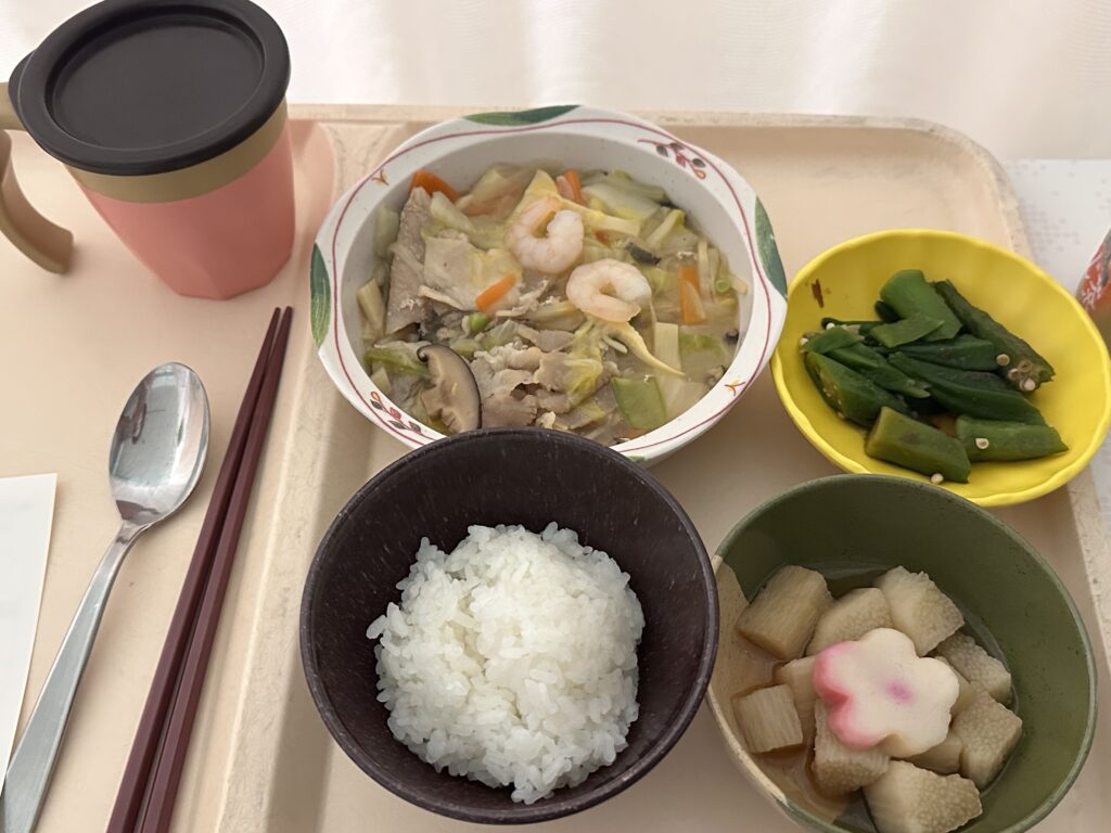 昼食:八宝菜、長芋の白煮、オクラの煮浸し