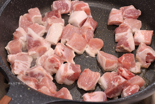 3.フライパンを中火で熱し、豚肩ロースを炒める。