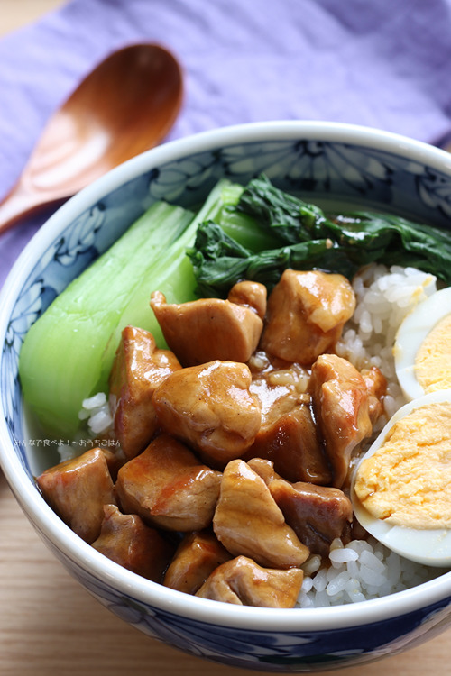器にごはんをよそい、ゆでたまご、青梗菜、肉を盛り付ける。