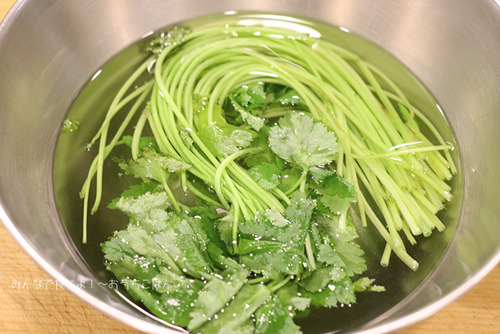 2.三つ葉は熱湯で30秒茹で冷水にとり冷ます。