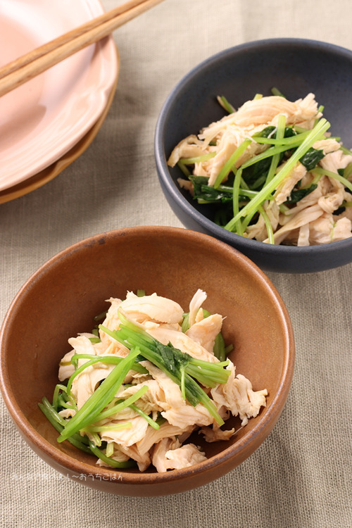 茹でて柔らかくほぐしたささみを香り良い三つ葉とポン酢醤油で合えました。