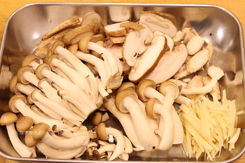 1.しめじとしいたけは石づきを取りしいたけは2mm厚さに切る。