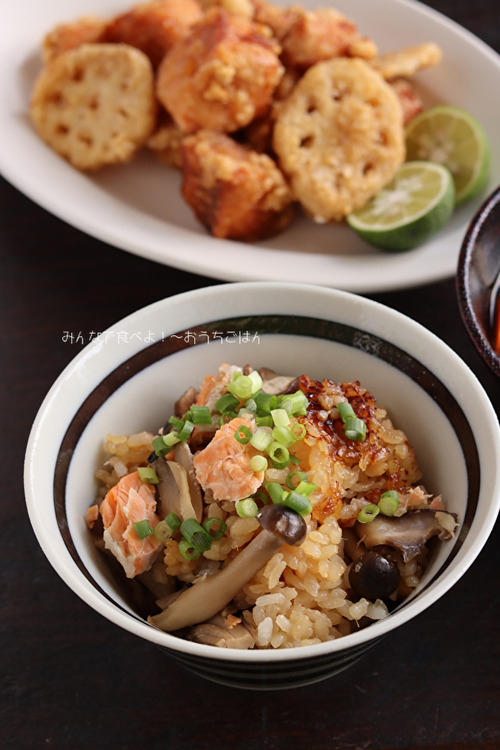 鮭もどーんと炊き込むので楽ちんです。