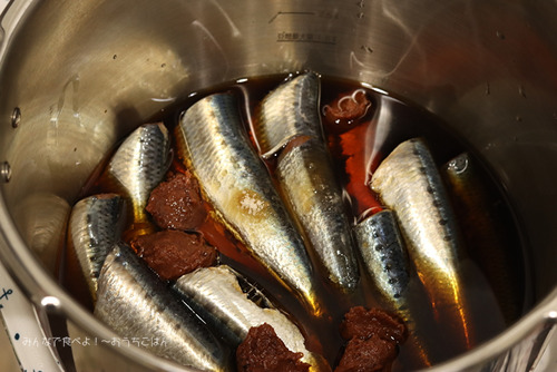 2.圧力鍋にイワシを並べて調味料と梅干しの種を入れて
