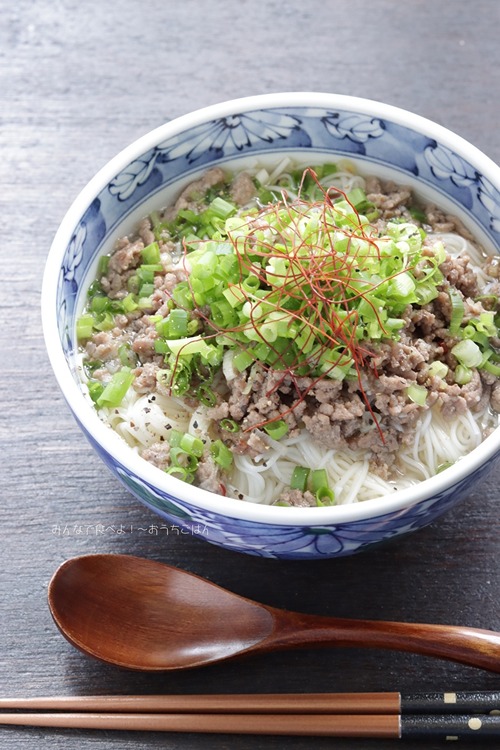 そうめん、いつもと目先を変えて肉そぼろ乗せにしたよ〜!